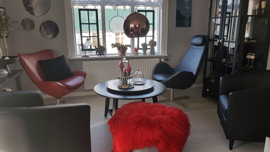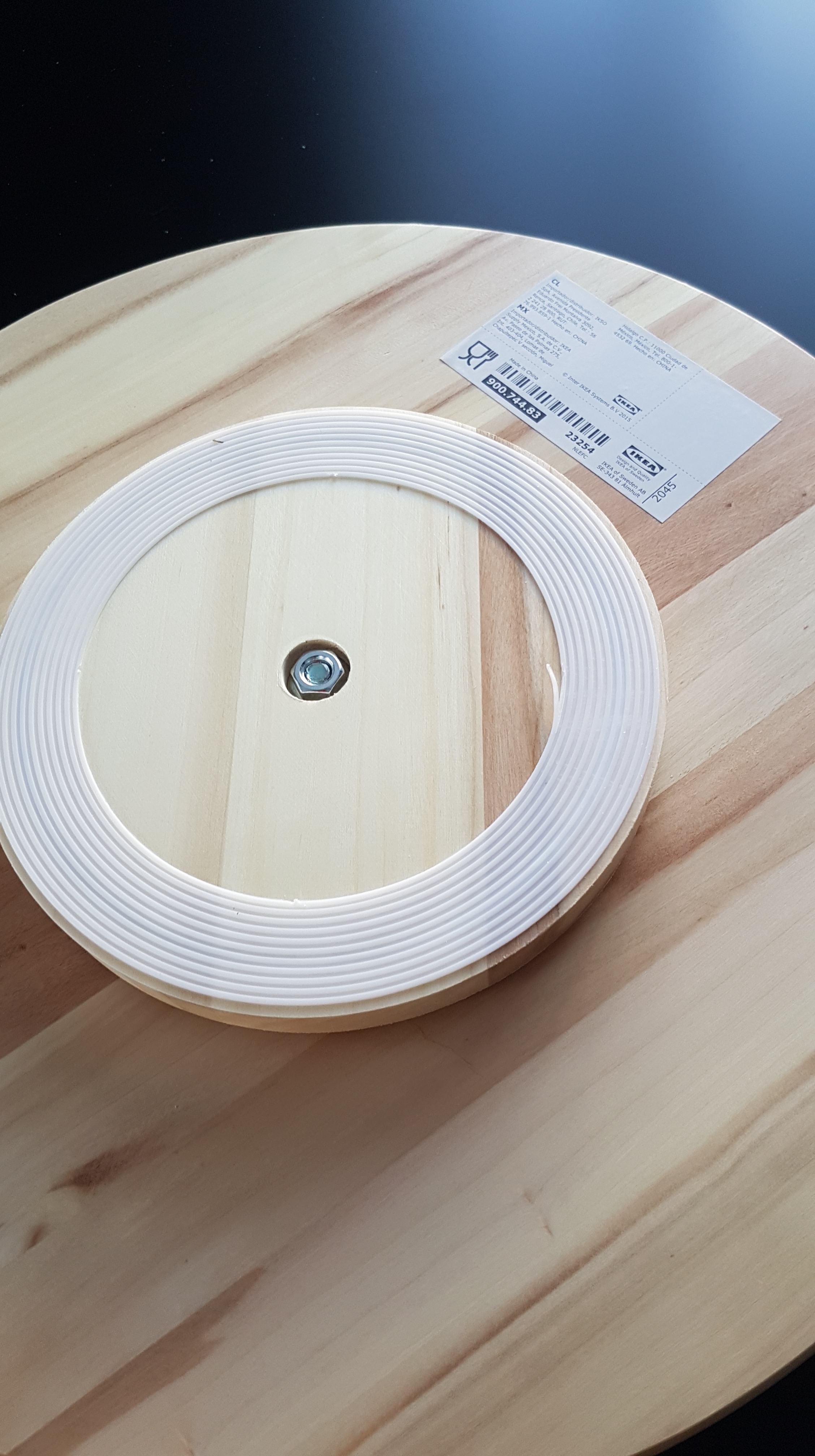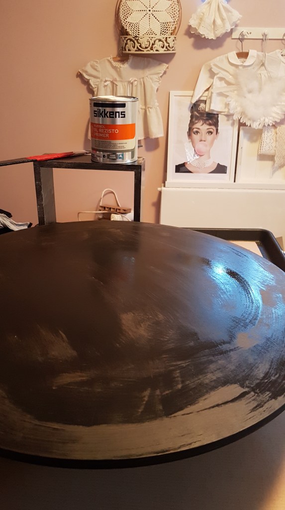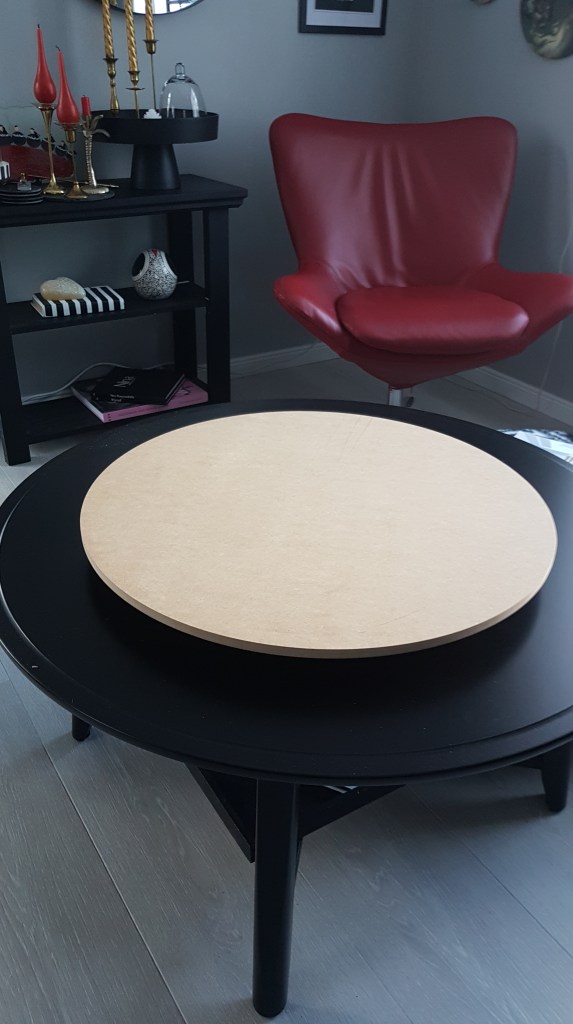 …mig „vantaði“ svo svakalega artýhring ofaná sófaborðið okkar. Svona til að hafa nú allt tilbúið þegar maður getur loksins boðið gestum aftur heim… við fengum stóran hring sem ég málaði svartann eins og borðið. Við skrúfuðum svo undir hann snúningshlutann undan IKEA snúningsdiski.