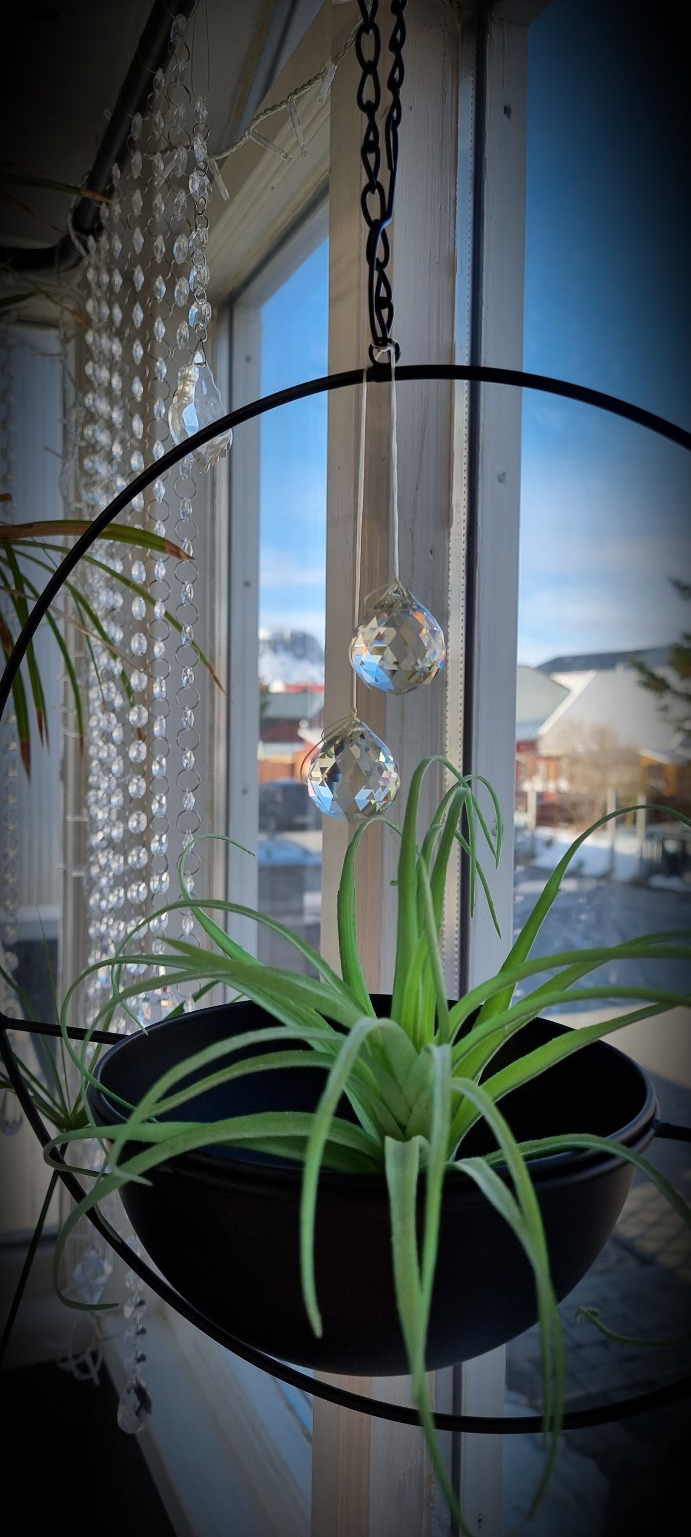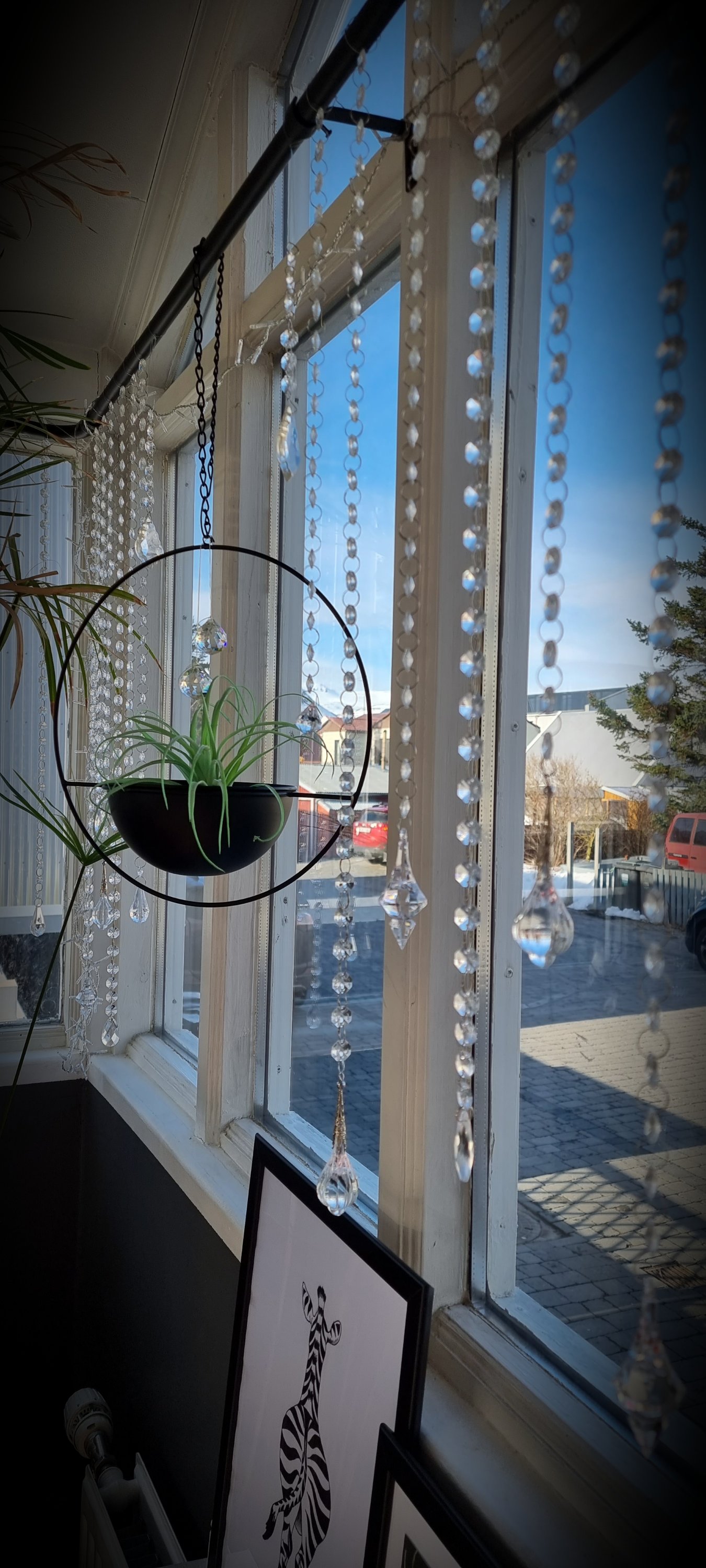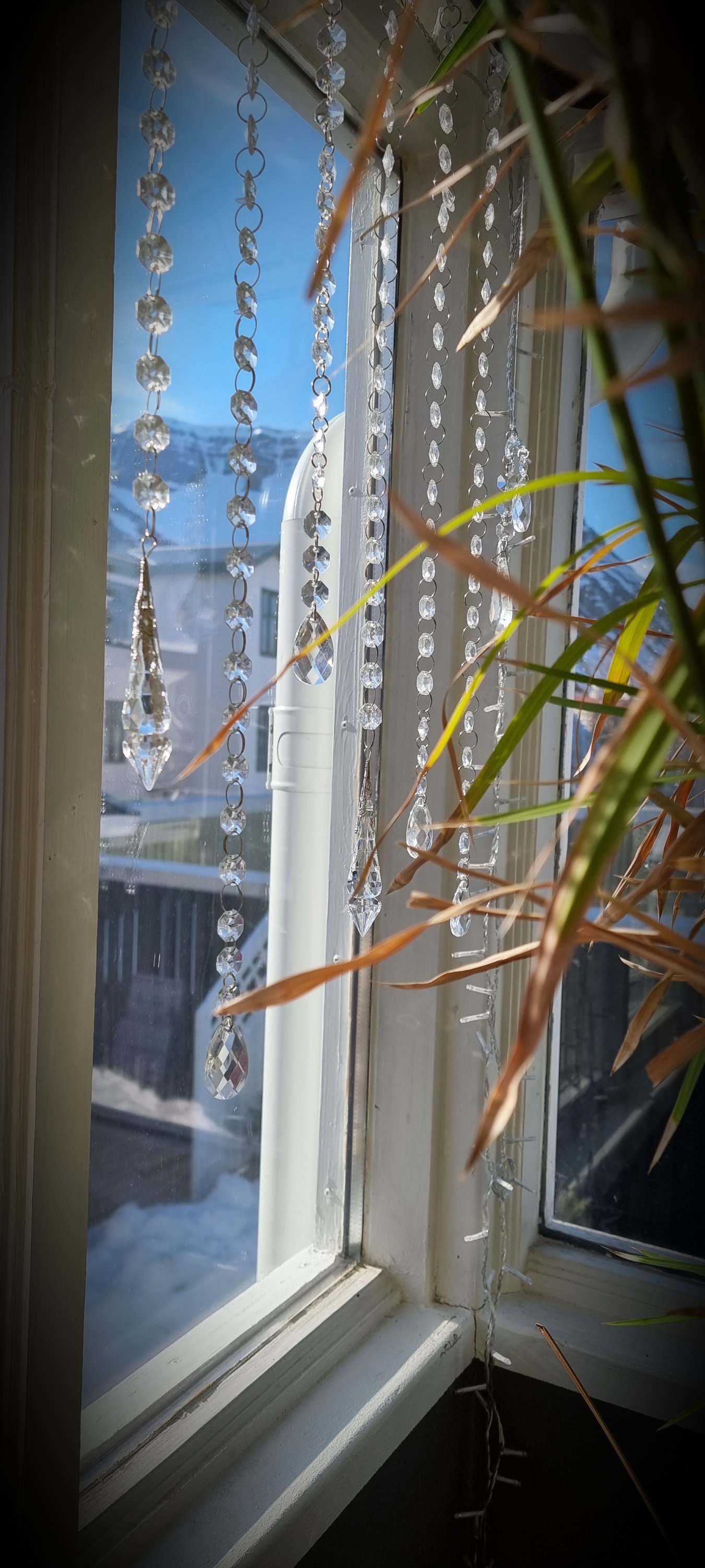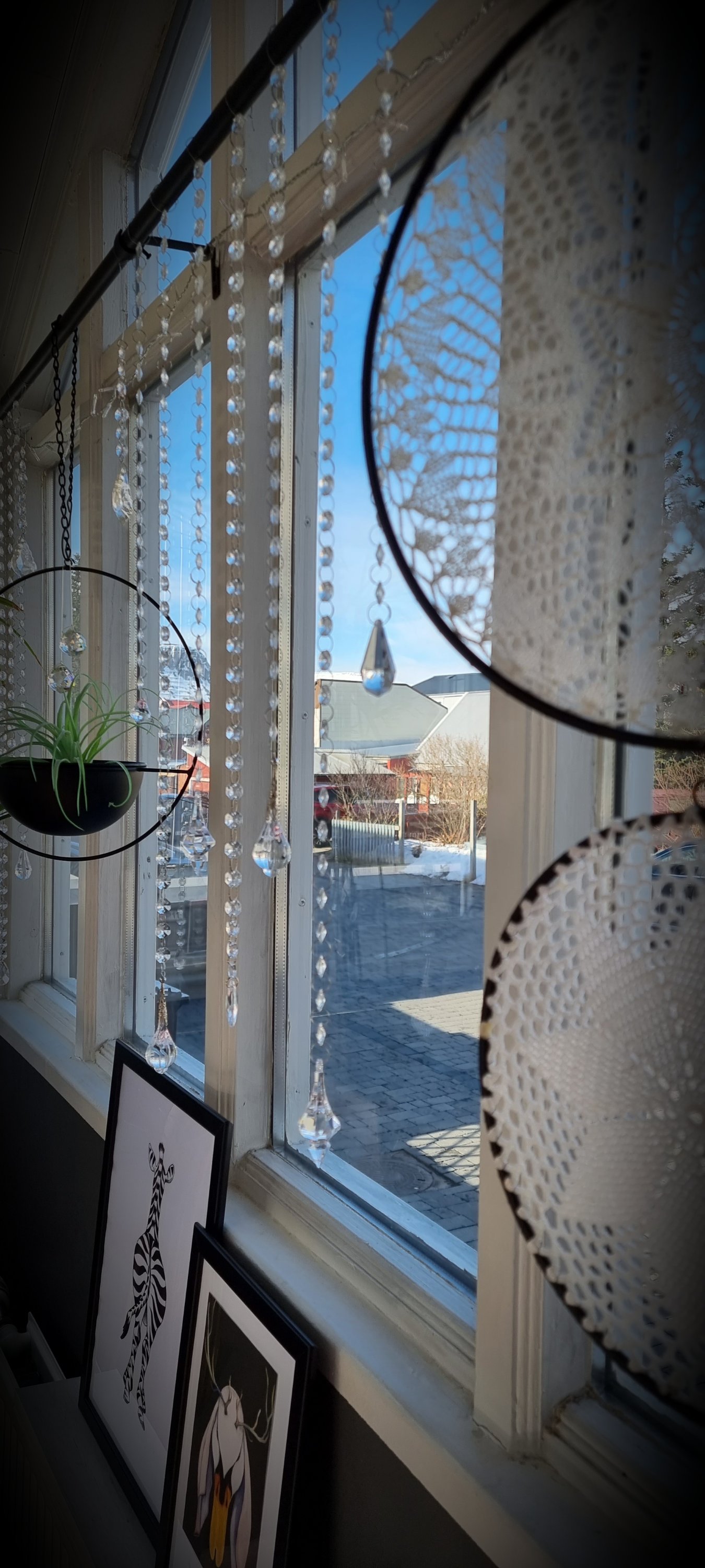 …ég á mikið af allskyns „kristölum“ svo að mig langaði að gera eitthvað skemmtilegt með það. Fyrst ætlaði ég að setja þá í stofugluggan en að endingu uru sólstofofugluggarnir fyrir valinu 😉