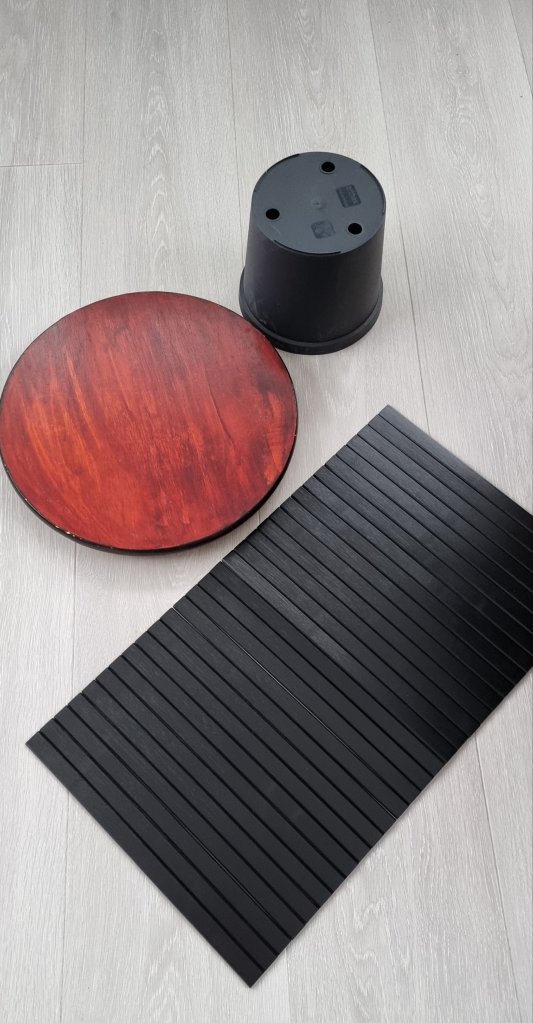 Armborðið vafið og límt utan um blómapottinn og hringdisknum skellt ofan á….