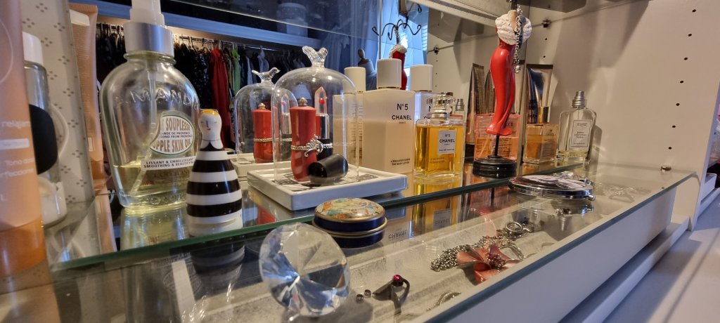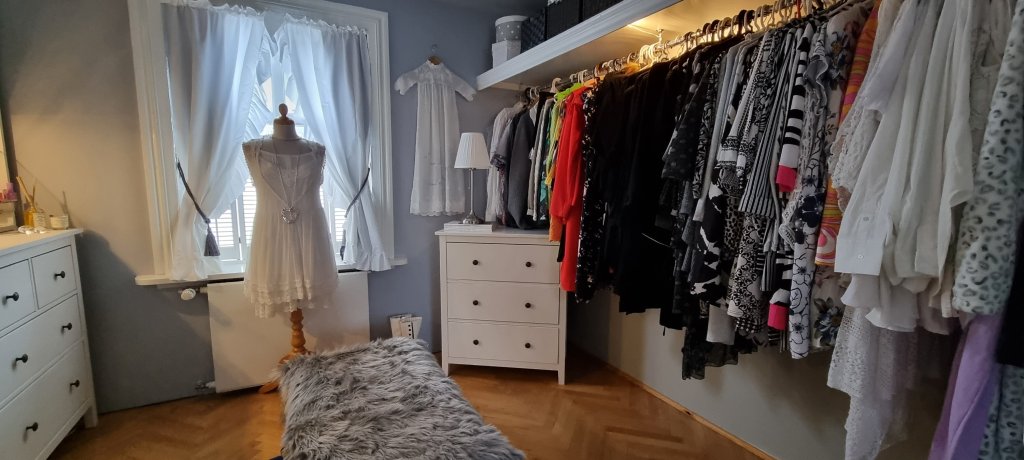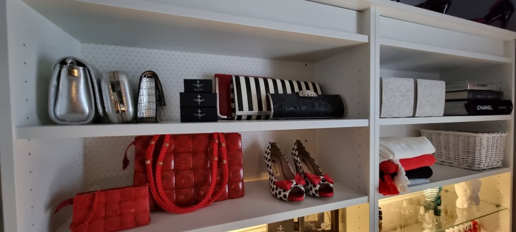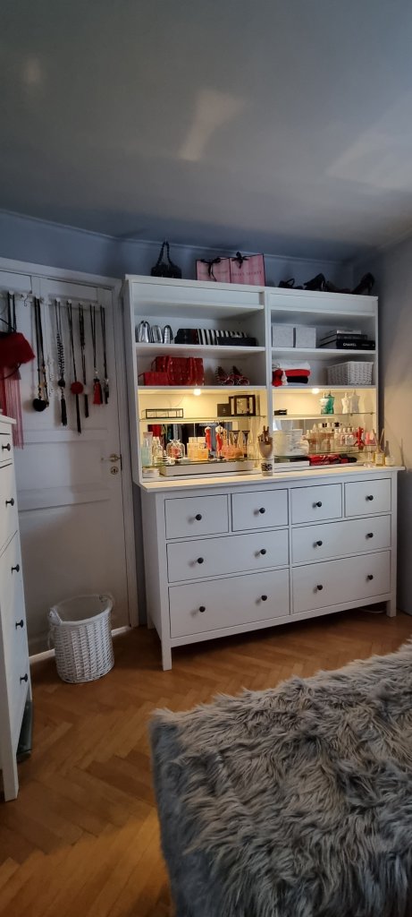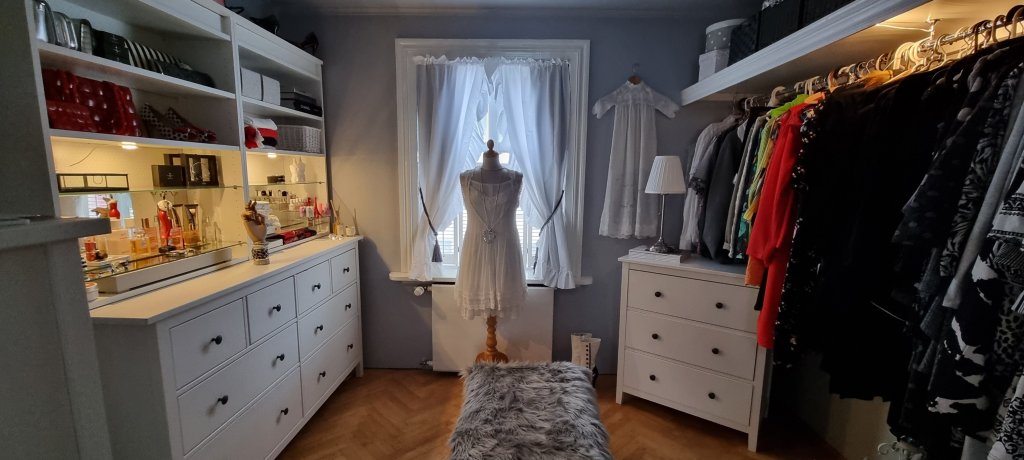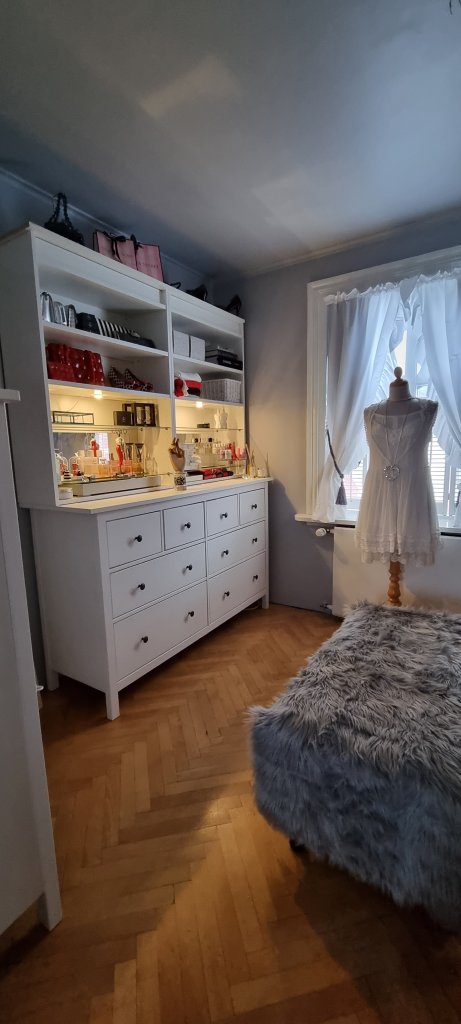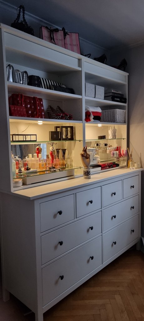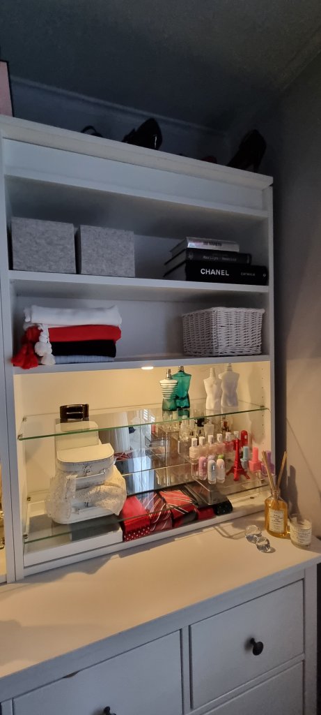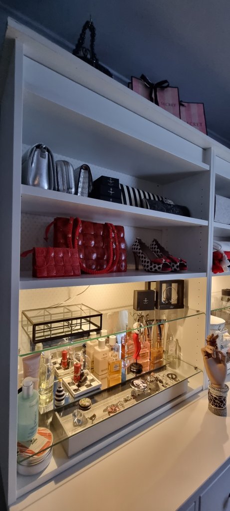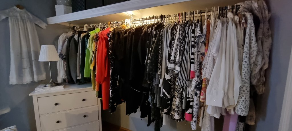 …við vorum með dökk bláan mattan lit á svefnherberginu okkar og mér fannst veggirnir alltaf vera „loðinn“ af ryki og ég orðin þreytt á að vera að moppa þá sí og æ…. Því var keypt málning með léttum glans og ljósari sem auðveldara væri að þrífa. Nú víst að maður var komin með málninu í pensilinn þá máluðum við líka fataherbergið hátt og lágt i sama lit. Ég keypi líka Billy bókahillur úr IKEA til að setja(á hvolf) ofaná kommóðu sem við erum með í fataherberginu…